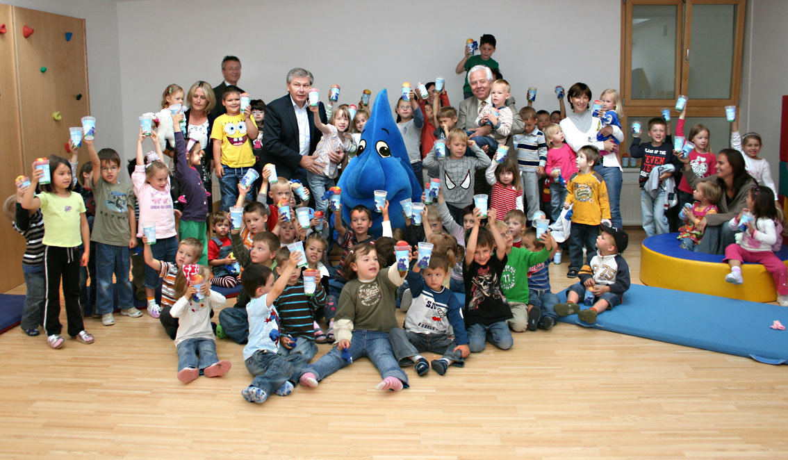 Gemeinsam mit NR Bgm. Gerhard Steier verschenkte er Tropfi-Trinkbecher und einen gesunden Apfel an die Kinder. Bgm. Alfred Grafl, 1. Obmannstellvertreter des Wasserleitungsverbandes Nördliches Burgenland, erklärte den Kindern, wie wichtig Wasser für die Konzentration, gesunde Zähne und eine altersadäquate Gewichtsentwicklung ist. Diese Botschaften werden den burgenländischen Kindergartenkindern auf spielerisch lustige Weise auch im Rahmen der Aktion „Trink dich fit mit Tropfi“ vermittelt. Die 85 Kinder waren von Tropfis Auftritt hellauf begeistert.