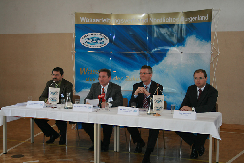 Anlässlich der Pressekonferenz präsentierte der Obmann des Wasserleitungsverbandes Bgm. Ing. Gerhard Zapfl auch die neu gestaltete Wanderausstellung, die selbstverständlich das vielfältige Thema WASSER zum Inhalt hat. Die Ausstellung umfasst 24 Schautafeln, welche neben der sinnvollen Nutzung des kostbaren Wassers, den Wasserkreislauf, die Förderung und den Transport des Wassers von seinen Ursprüngen bis in den Haushalt, auch die Historie des Verbandes in unterhaltsamer Art darstellt.