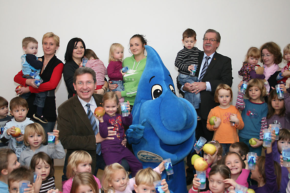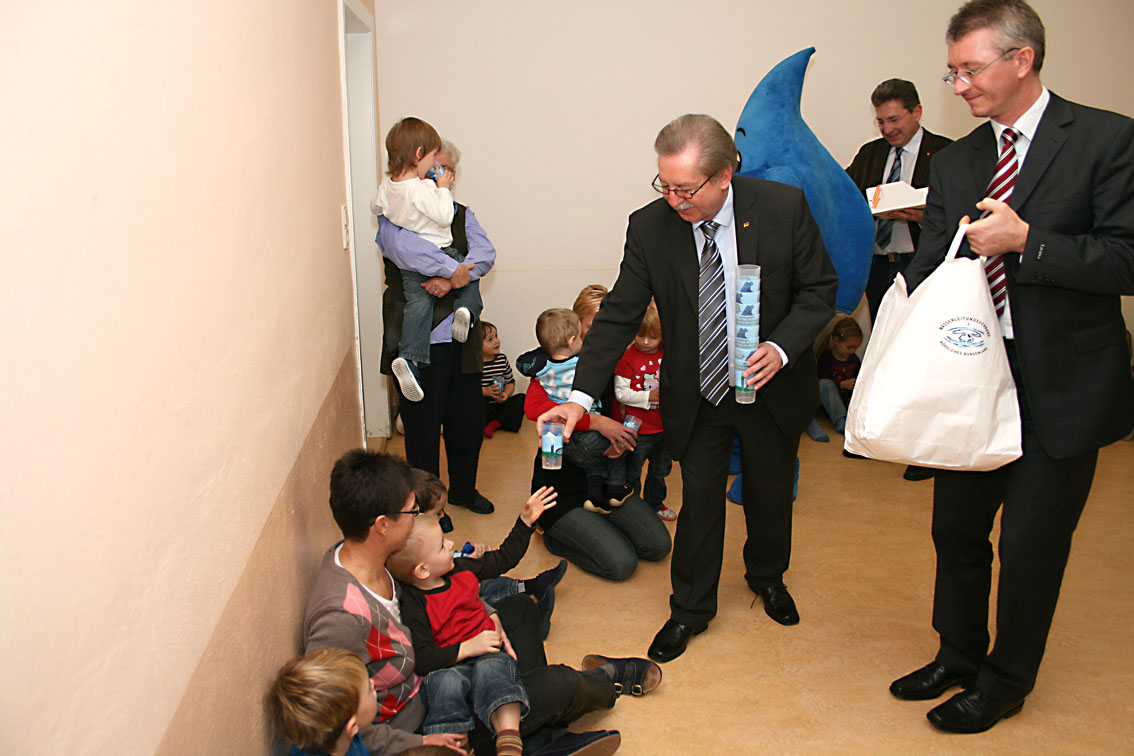 Während Obmann Gerhard ZAPFL die Aktion näher erläuterte und auf die Bedeutung dieser toll angelaufenen Kampagne verwies, überreichte LABg. Bgm. Ernst SCHMID jedem Kindergartenkind einen Trinkbecher für den täglichen Gebrauch.